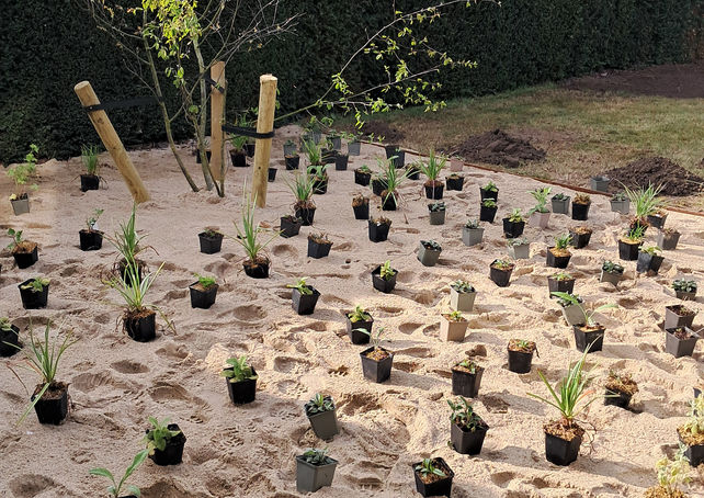 Tabula rasa voor deze tuin. De buxus werd eruitgehaald, samen met nog andere struiken twee bolacacia's en andere ouderwetse beplanting. Men stond open voor een volledig nieuwe switch en gaf me carte blanche voor een nieuw beplantingsplan. Liefst zo onderhoudsvriendelijk mogelijk, dus wat resulteert in een redelijk aantal verschillende soorten planten. Hoe meer soorten beplanting, hoe minder "kruid" zal opvallen in een border en je minder snel zal moeten wieden. De tuinaannemer met wie we samenwerkten stelde voor om een dikke laag zand tussen de planten op te voeren zodat kruid minder rap zal opkomen en tegen dan de vaste planten al een redelijke omvang zullen hebben. De vorm van de bestaande baroktuin werd behouden en werd opgefleurd met wat minder strakke beplanting vol texturen, geuren en kleuren.